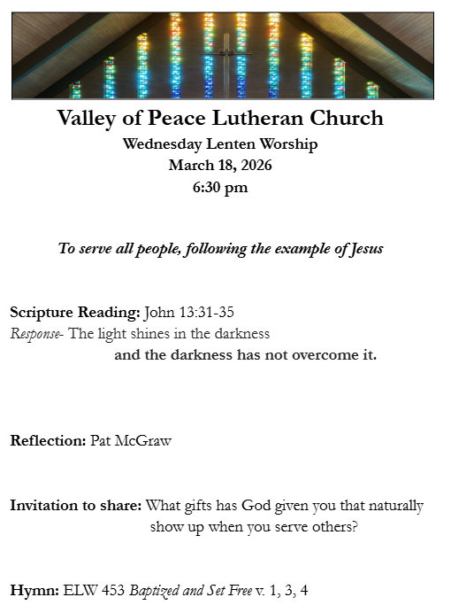 Our Worship Service on Sunday will happen on Valley of Peace YouTube. Scroll down to see the most recent bulletin and announcements.